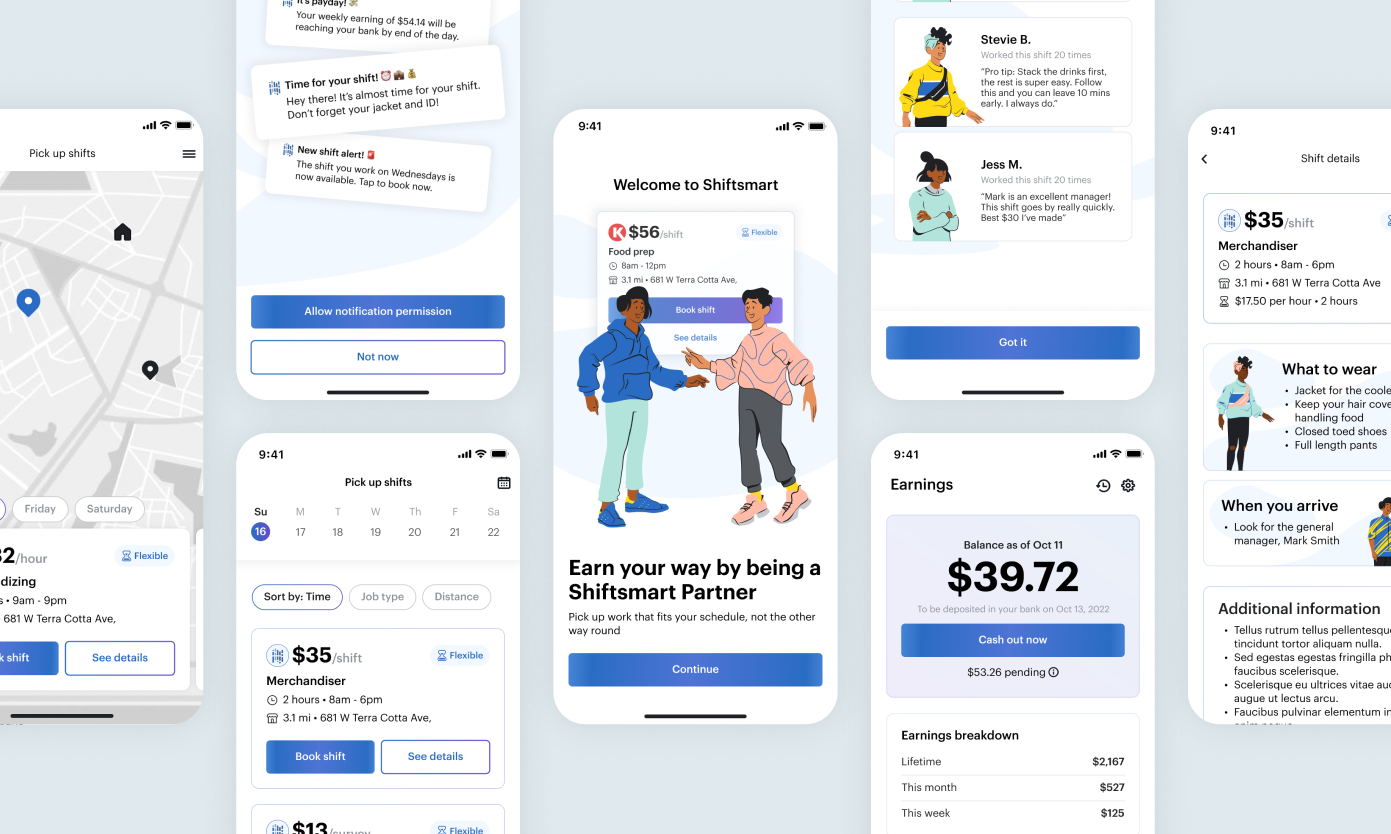 Shift Smart is a worker-first platform that specializes in bridging part time and shift-based workers with nearby demand. The team was seeing a 50% drop in first-time shifts because workers lacked information and incentive to show up. I was brought on to create a personalized and delightful onboarding experience while creating a cohesive design language and brand perspective. I guided the team through a branding exercise, pulling from open source images and illustrations so they could scale. I handed off an onboarding flow that helped users understand what role they are signing up for, what shifts are right for them, what others have to say about working at those shifts, and how to prepare for their first day.